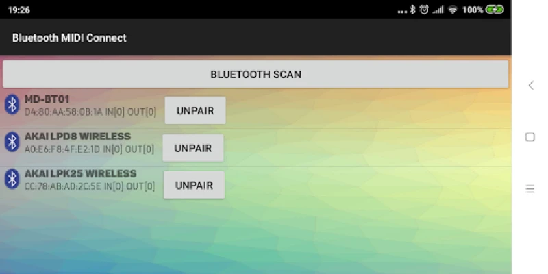 Bluetooth MIDI Connect is tested and working with: - YAMAHA MD-BT01 (recommended) - YAMAHA UD-BT01 - AKAI LPK25 WIRELESS - AKAI LPD8 WIRELESS - KORG microKEY Air - HiFing (Kaixinlian) MIDI Adapter (note on / note off midi messages only)