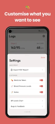 Customization is key, and our blood pressure tracker app lets you tailor your experience to fit your unique needs. Toggle options like medication status, blood pressure stages, and add custom notes to provide a comprehensive snapshot of your health in your BP diary.