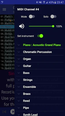 🎵 Advanced Playback Control: Transpose notes, adjust tempo, and customize each MIDI channel’s instrument and attributes like Pan, Chorus, and Reverb.