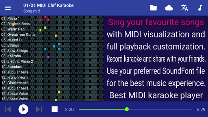 Whether you're a casual music lover or a seasoned enthusiast, MIDI Clef is the ultimate music companion! Play MIDI files and enjoy karaoke with rich features like karaoke recording, customizable playback, and multi-format support that you won’t find in typical MIDI players.